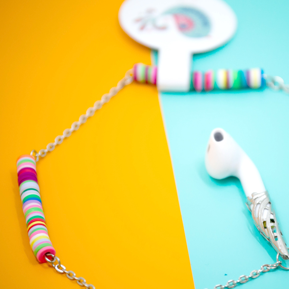 حافظ على سماعة AirPods الخاصة بك آمنة مع هذه السلسلة المصنوعة من خرز بوليمر كلاي متعدد الالوان و سنسال ناعم باللون الفضي. تصميم حديث وعصري ، ويتميز سنسال مرن على كلا الطرفين يمكن توصيله بسهولة بسماعات AirPods – مع التأكد من عدم فقدها مرة أخرى! مصممة خصيصا لك لتتميز بمظهر عصري و موضه جديده ويمكن ان يقدم هدية جميلة